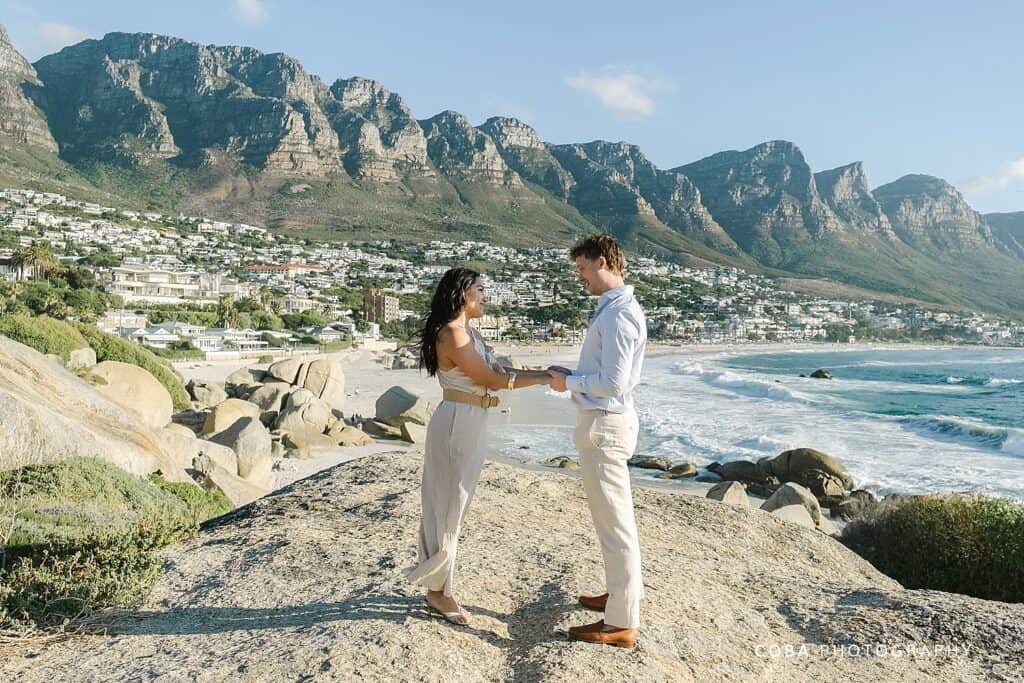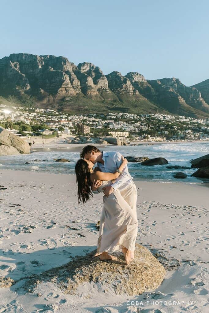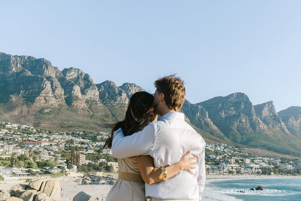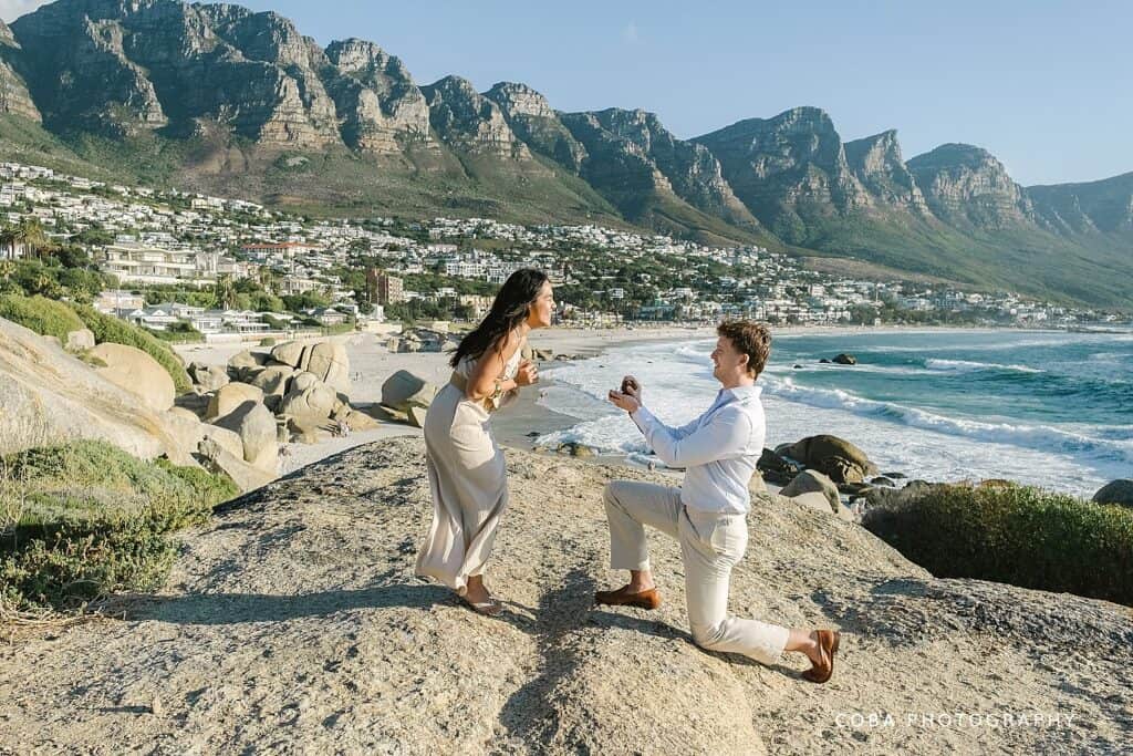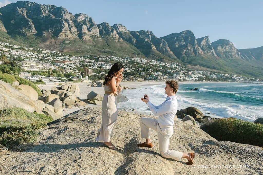 A romantic Maiden's Cove sunset proposal in Cape Town with the Twelve Apostles mountains in the background.