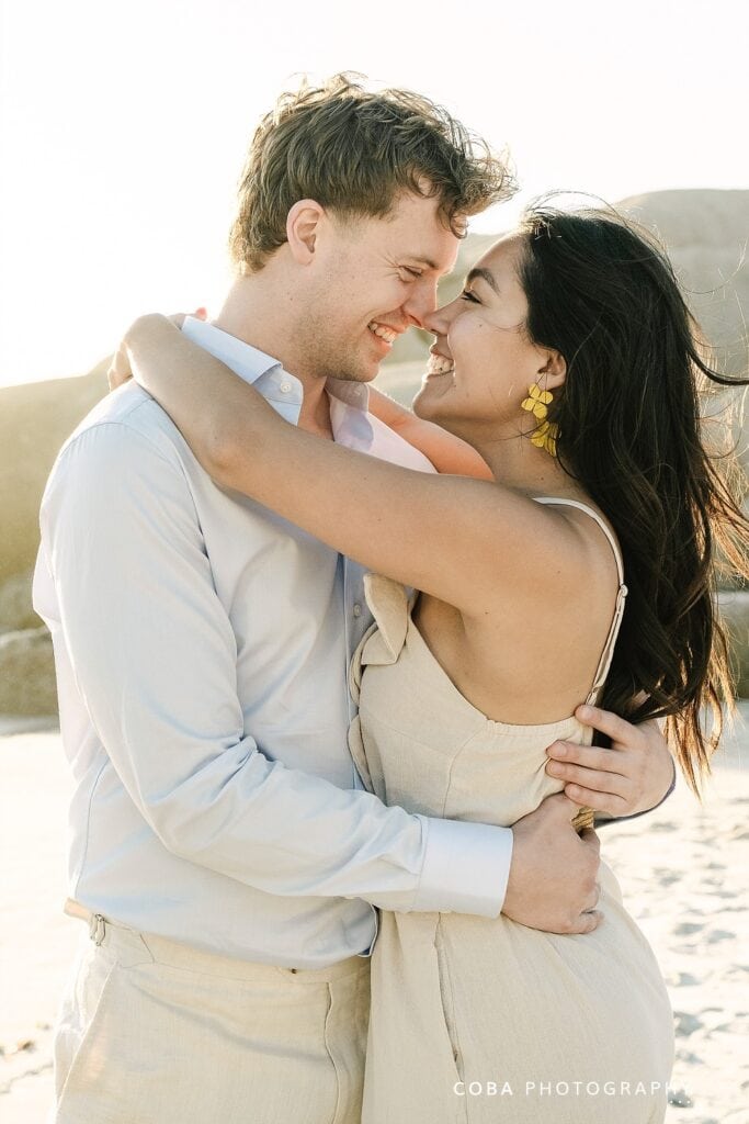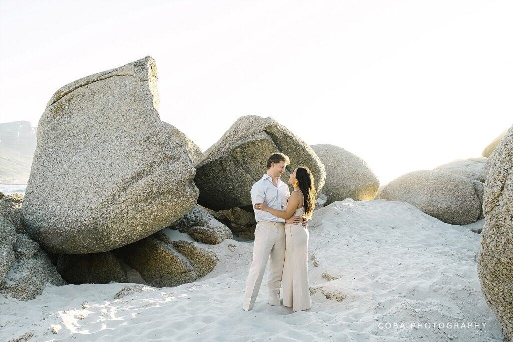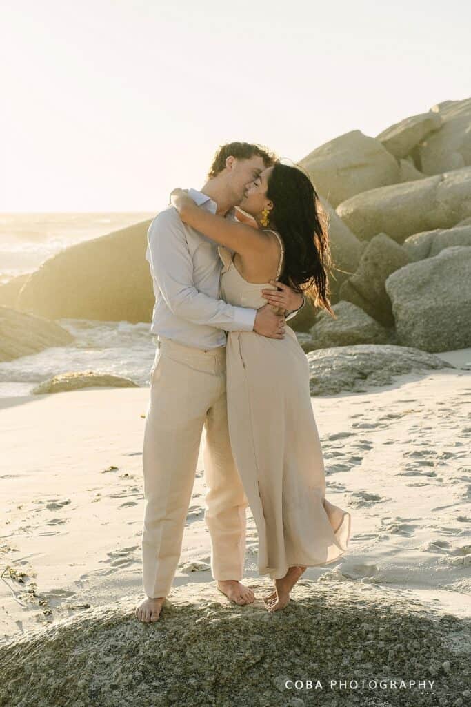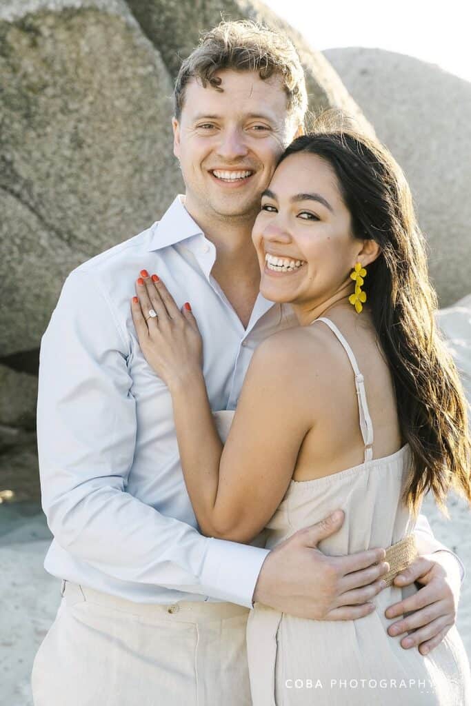 Newly engaged couple embracing during a Camps Bay sunset proposal at the iconic Maiden’s Cove lookout. Surprise engagement at Maiden's Cove scenic lookout featuring the Atlantic Ocean and granite boulders at golden hour.
